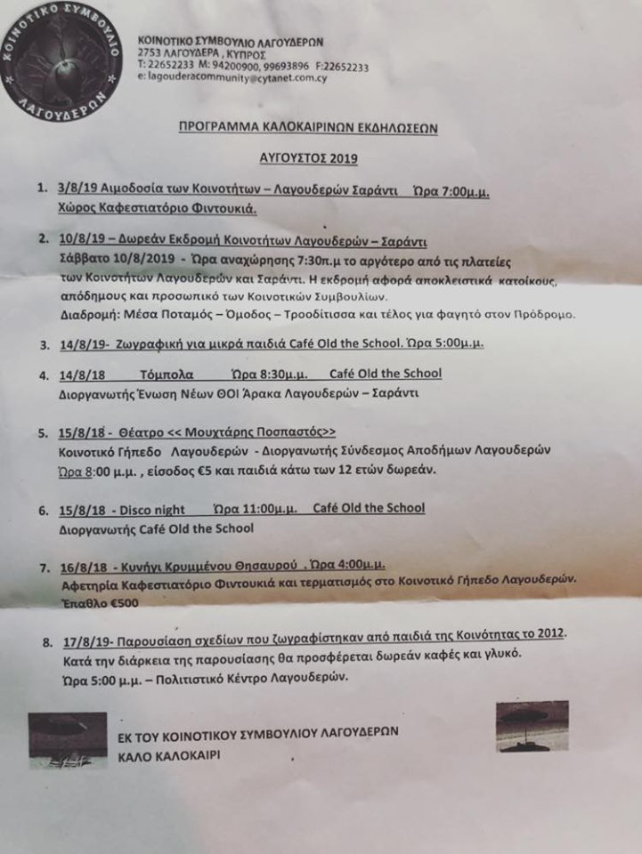 Πρόγραμμα Καλοκαιρινών Εκδηλώσεων Λαγουδερών 2019